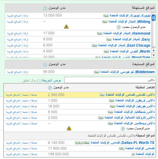 نوفر الآن ميزة عدد مرات الوصول لمساعدتك في تقدير الجمهور في الاستهداف المحدد. وتستند أعداد مرات الوصول هذه على عدد المستخدمين الظاهرين في مواقع تابعة لـ Google وقد تختلف اختلافًا كبيرًا عن أعداد الإحصاء. وينبغي استخدام مرات الوصول فقط كدليل عام لمساعدتك في تحديد العدد التقريبي للمستخدمين في موقع مستهدف مقارنةً بمواقع أخرى مستهدفة. فعلى سبيل المثال، من لقطة الشاشة المعروضة أدناه، ستلاحظ أن استهداف المنطقة المركزية لمدينة دالاس قد يحقق وصول أكبر بثلاثة أضعاف من الوصول لمدينة دالاس.