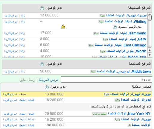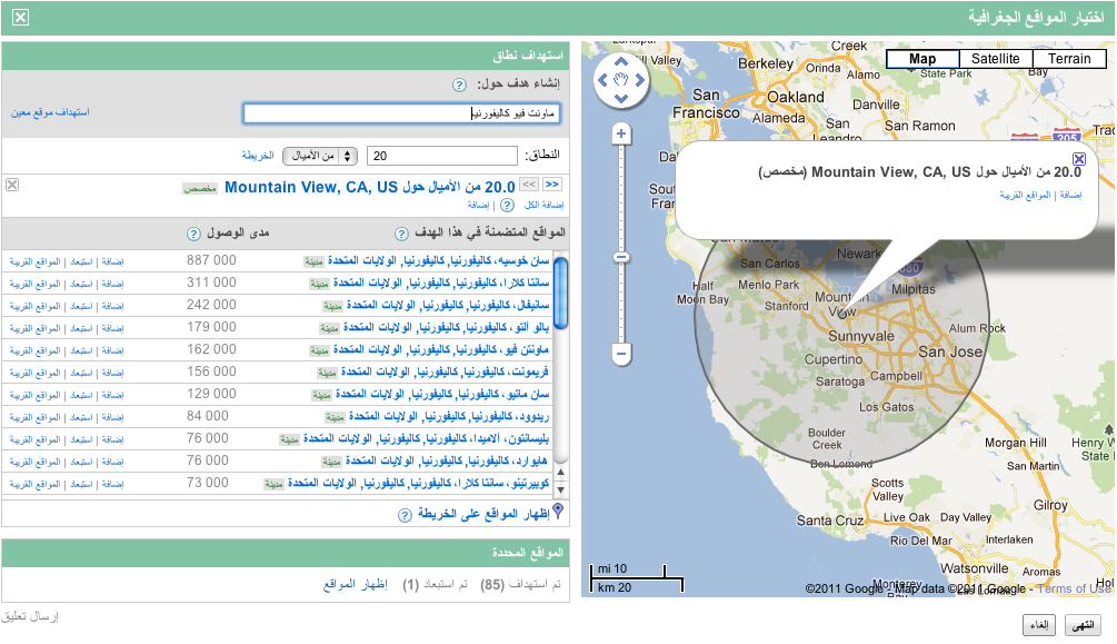 لتقديم أفضل انطباع ممكن للمعلنين، ربطنا ميزة الموقع الجغرافي المستهدف في AdWords بخدمة خرائط Google. وهذا سيتيح لنا تقديم مزيد من المعلومات عن المواقع وتقديم اقتراحات للمواقع ذات الصلة، بالإضافة إلى تحسين مستوى دقة الموقع الجغرافي المستهدف. نعتقد أن هذه التغييرات ستجعل من ميزة الموقع الجغرافي المستهدف أداةً أكثر فائدة لتحسين نتائج الحملة.